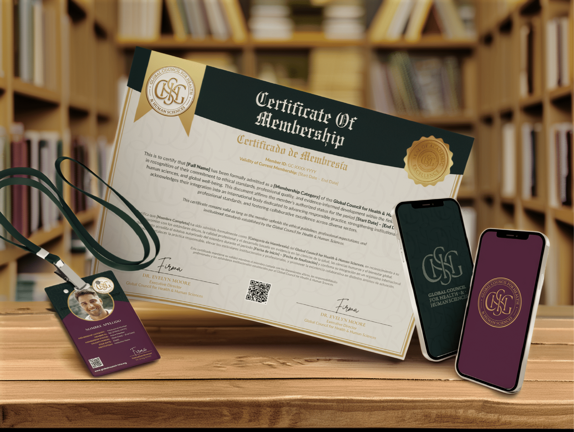 Al sumarte, recibirás las credenciales oficiales que materializan tu pertenencia a la red global GC-HHS. Esta es una documentación desarrollada para proyectar autoridad en cada etapa de tu carrera.